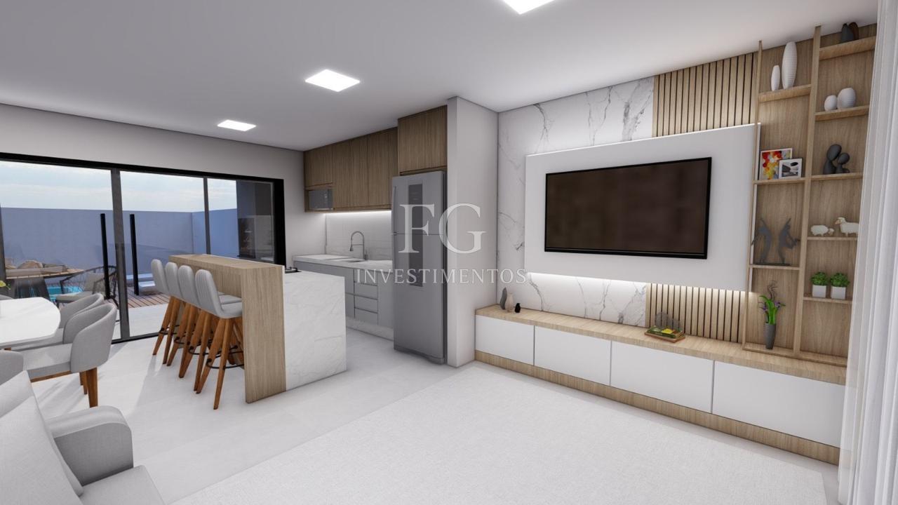 O pavimento térreo conta com living integrado a sala de jantar e cozinha, criando um ambiente amplo para convivência, além de lavabo, lavanderia e varanda para momentos ao ar livre.